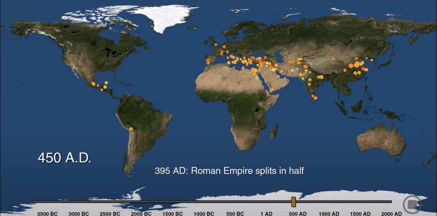 This East-West effect is very obvious when you see the record of cities in History. The following map shows which cities are known to have existed by 450 AD.