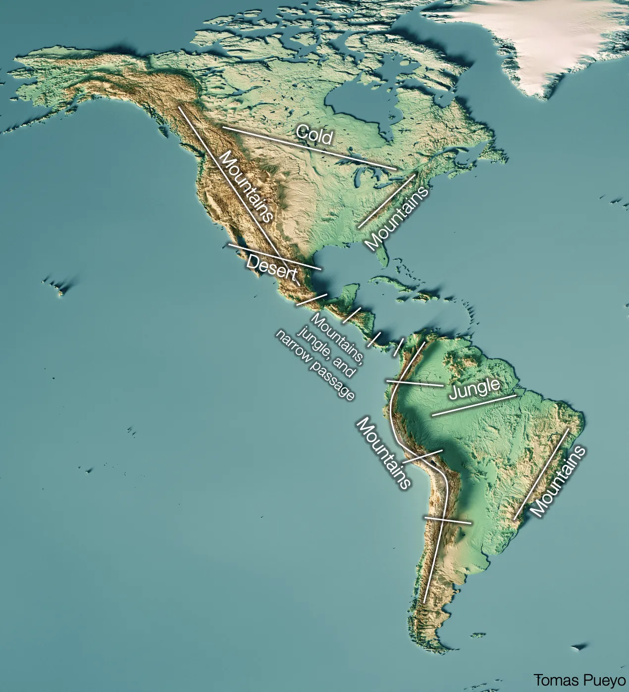 These East-West axes were not good enough for lots of diverse resources and technologies to emerge and share. The North-South axis sits across lots of climates, and on top of that, has huge barriers such as the narrow Central America and the Andes.