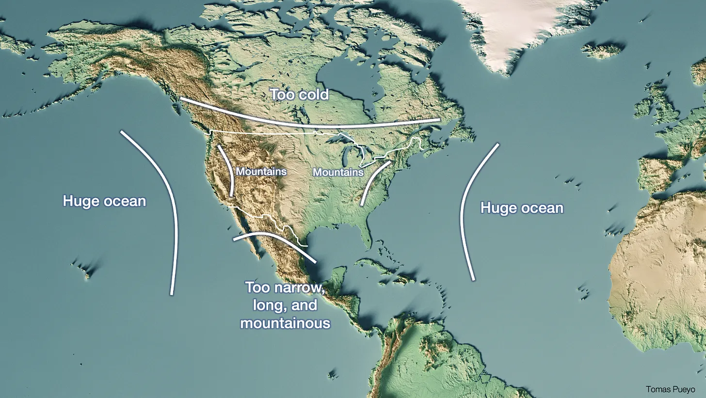 But America is structured in a North-South axis. It doesn’t have much width in any specific latitude. Both of its widest points are not the most efficient to develop advanced civilizations from scratch:
