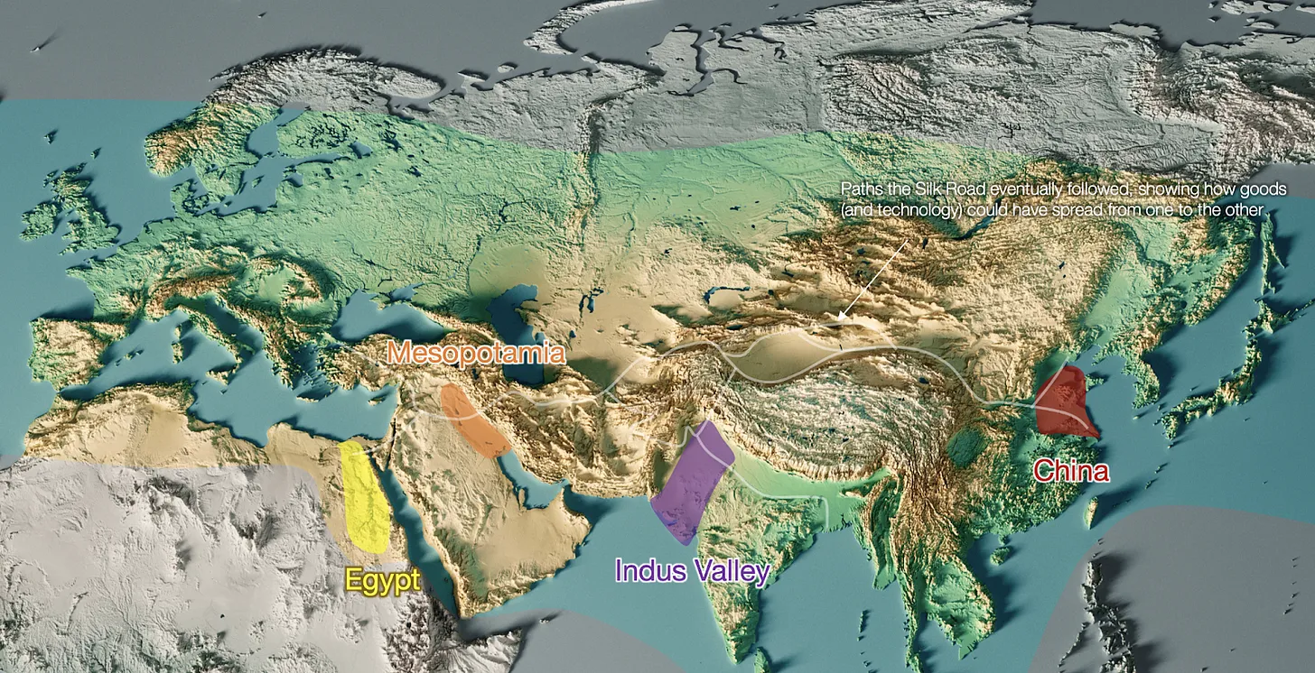 In that path, there are deserts, jungles, and mountains. That isolated many places, such as Egypt, Mesopotamia, the Indus Valley, and China, enabling civilizations to emerge independently there. Every single one of these emerged around very powerful rivers: the Nile, the Tigris and Euphrates, the Indus Valley (and the Ganges), and the Yellow river (and the Yangtze).