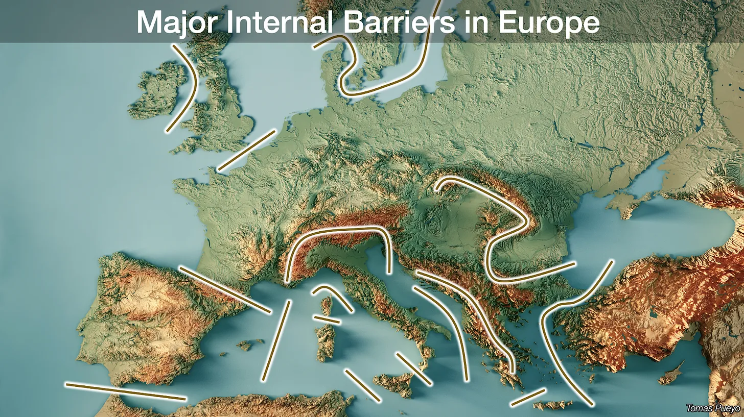 - Bigger internal barriers meant Europe was harder to unify. The result has been a diversity of technologies and approaches to civilization that could challenge each other. However, the barriers were not too high to prevent technology from spreading. More diversity of approaches, together with quick technological diffusion, meant more natural selection of ideas.
